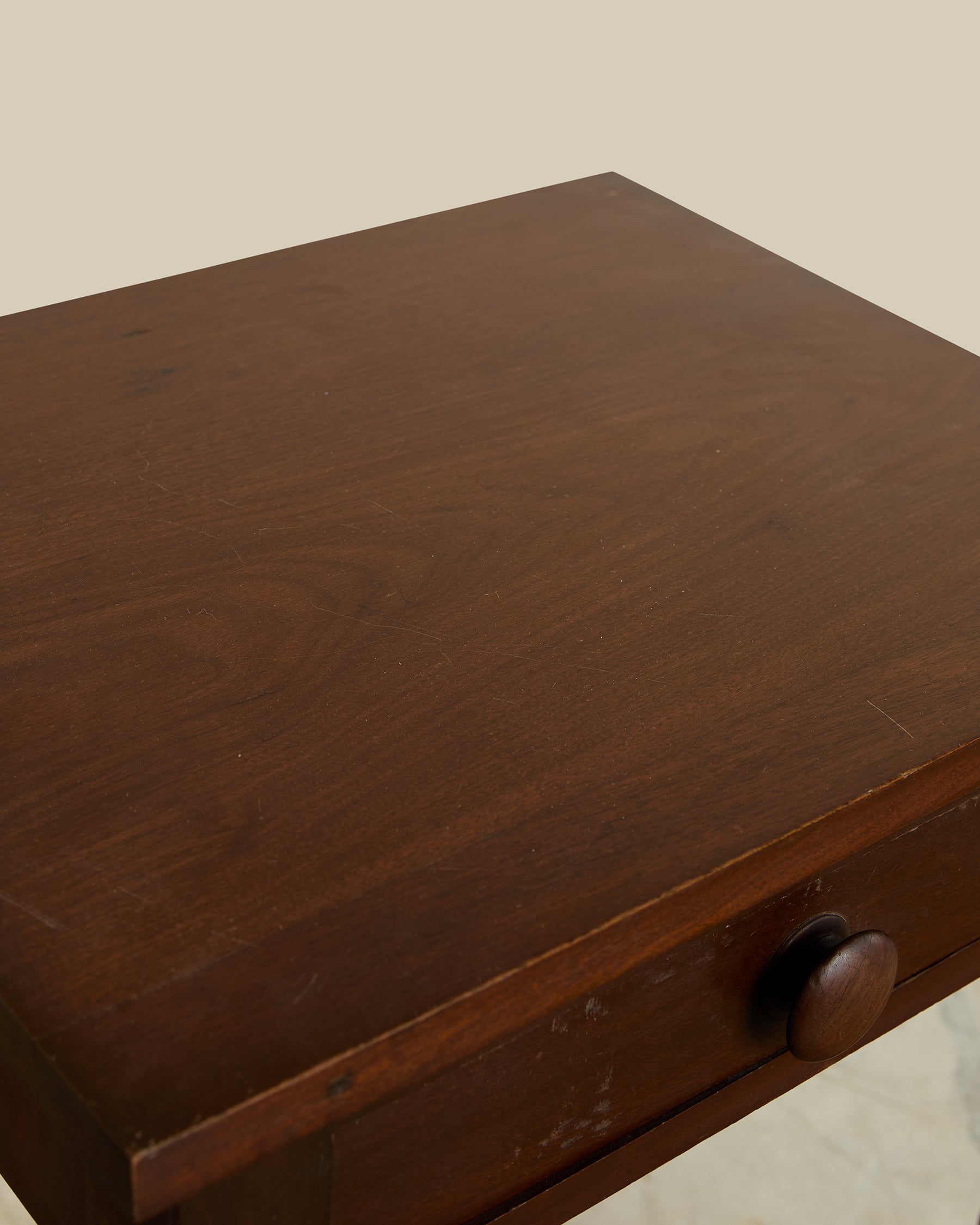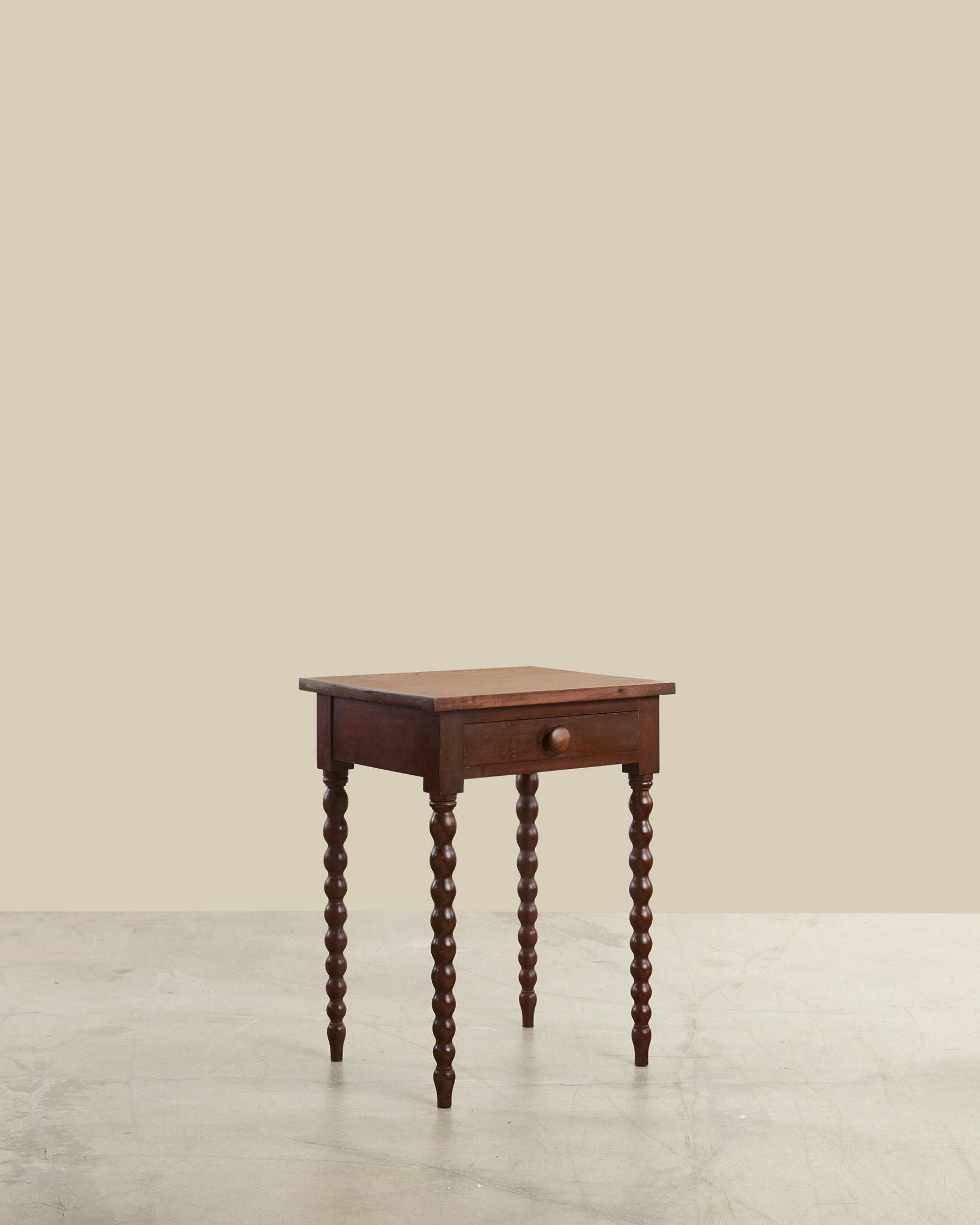Handcrafted from rich cherry wood, this American antique end table features elegant bobbin legs. The sturdy drawer provides discreet storage for everyday items, while the warm wood tones bring depth and sophistication to your space. Perfect for bedside use or beside a favorite chair, this timeless piece combines traditional craftsmanship with practical functionality. A beautiful addition that enhances any room with authentic vintage character.