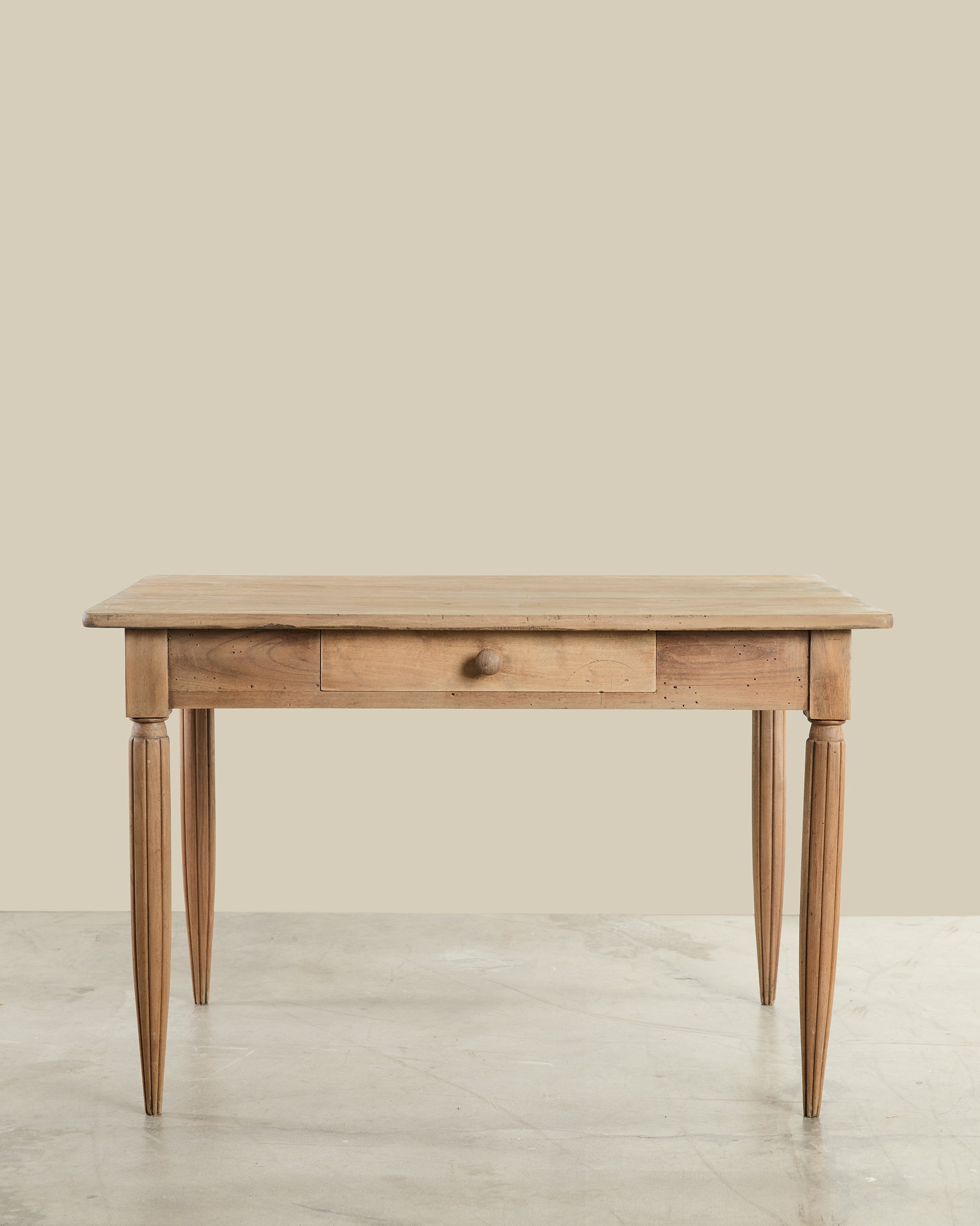 This authentic 1940s French desk features distinctive fluted detailing on gracefully tapered legs. This piece embodies the refined craftsmanship of mid-century European design. The sculptural leg work adds architectural interest while maintaining a sophisticated silhouette that complements both traditional and contemporary interiors. A functional statement piece that transforms any room into a curated, cultured space.