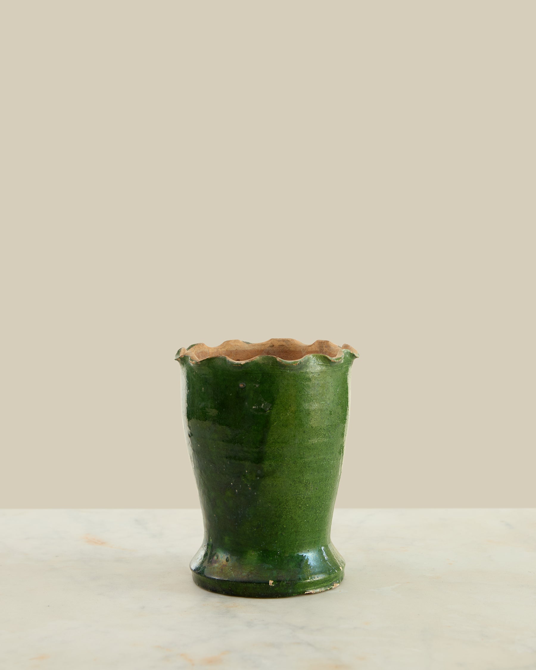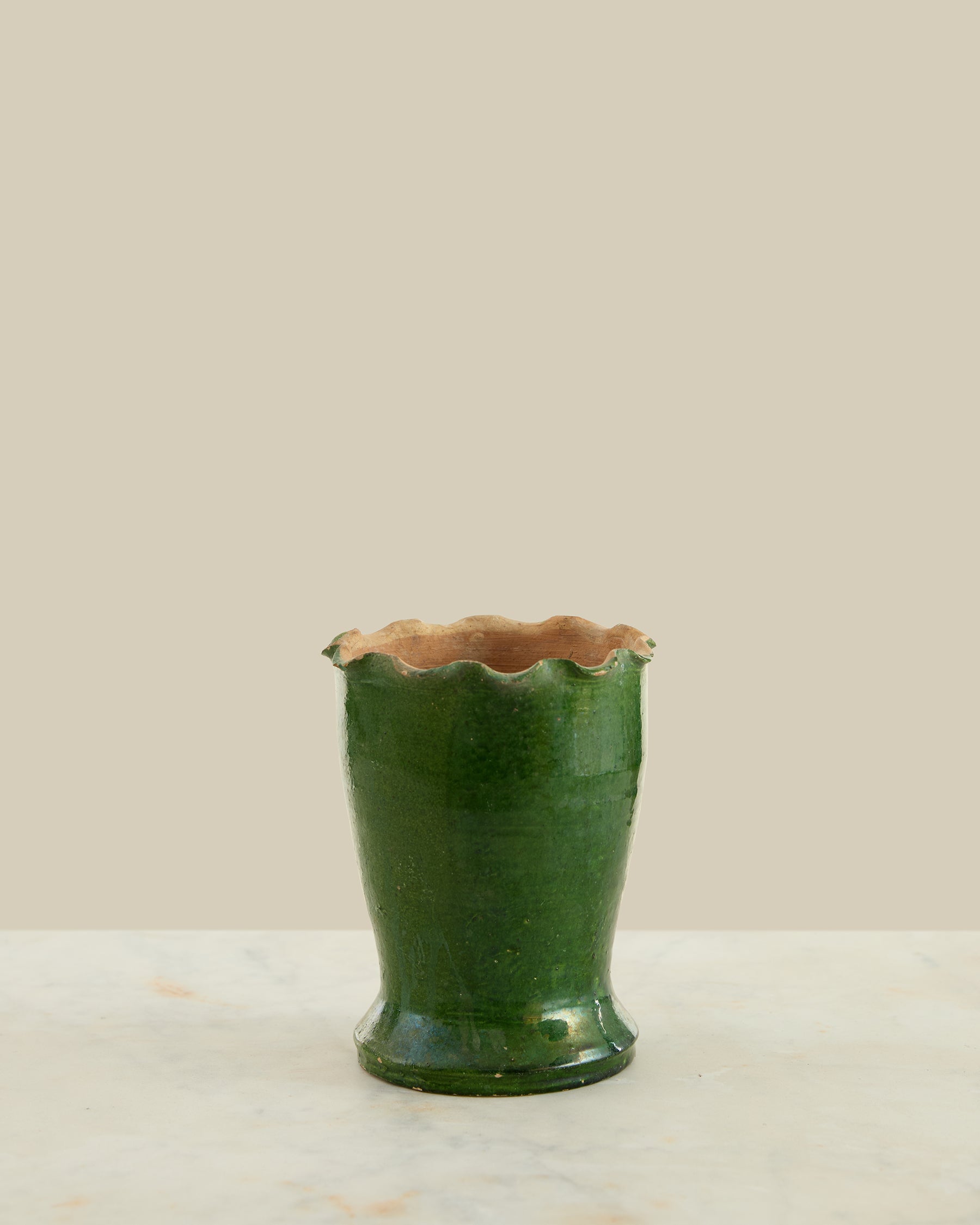 This 1950s French vase showcases soft green glazing with graceful scalloped edges that add dimension and visual interest. Perfect for displaying seasonal flowers or standing alone as a vintage accent piece, it brings authentic mid-century charm to shelves, mantels, or side tables. The color and refined shape reflect the understated elegance of French design from this era. A genuine period piece with enduring appeal.