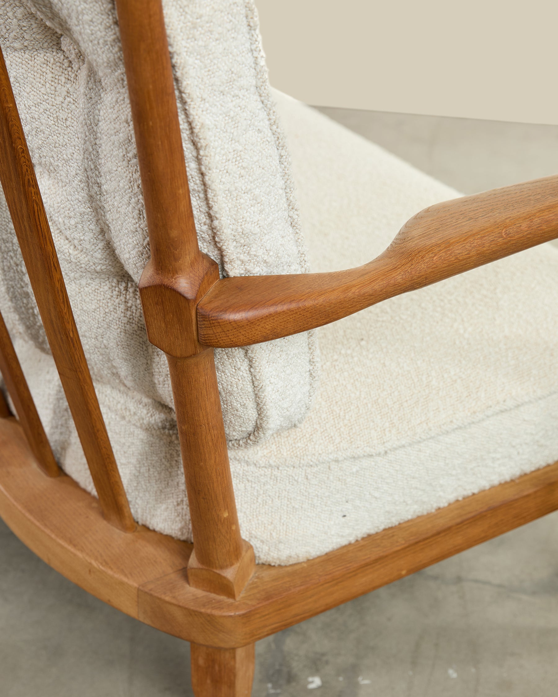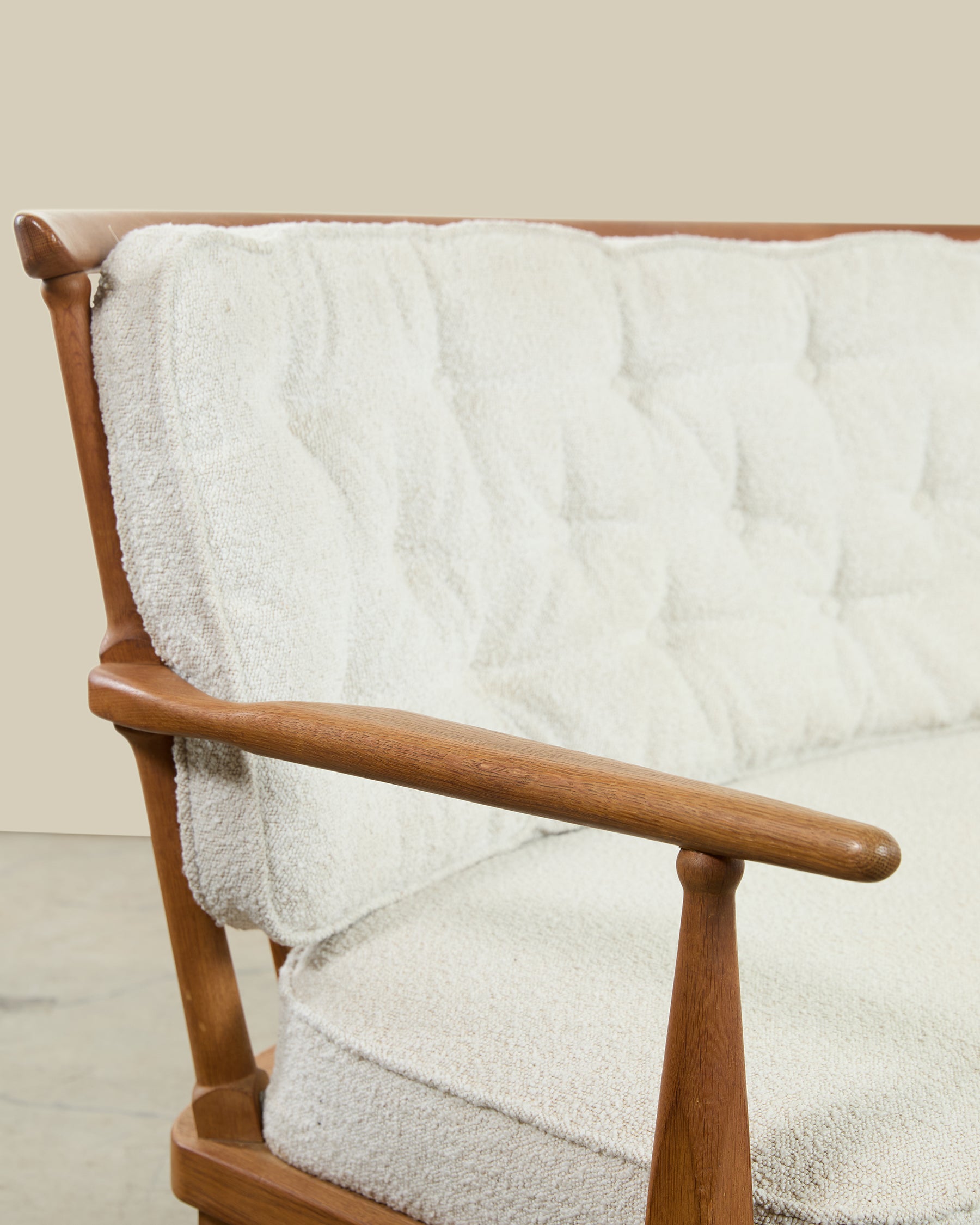 This exceptional L-shaped sofa by Guillerme et Chambron exemplifies mid-century modern design at its finest. Wrapped in soft white boucle fabric, and built with solid wood construction and clean architectural lines, it offers generous seating that adapts to any living space. The sofa's timeless silhouette and quality craftsmanship make it a versatile anchor piece—equally at home in minimalist, eclectic, or traditionally styled rooms. A designer investment that combines comfort with enduring elegance.