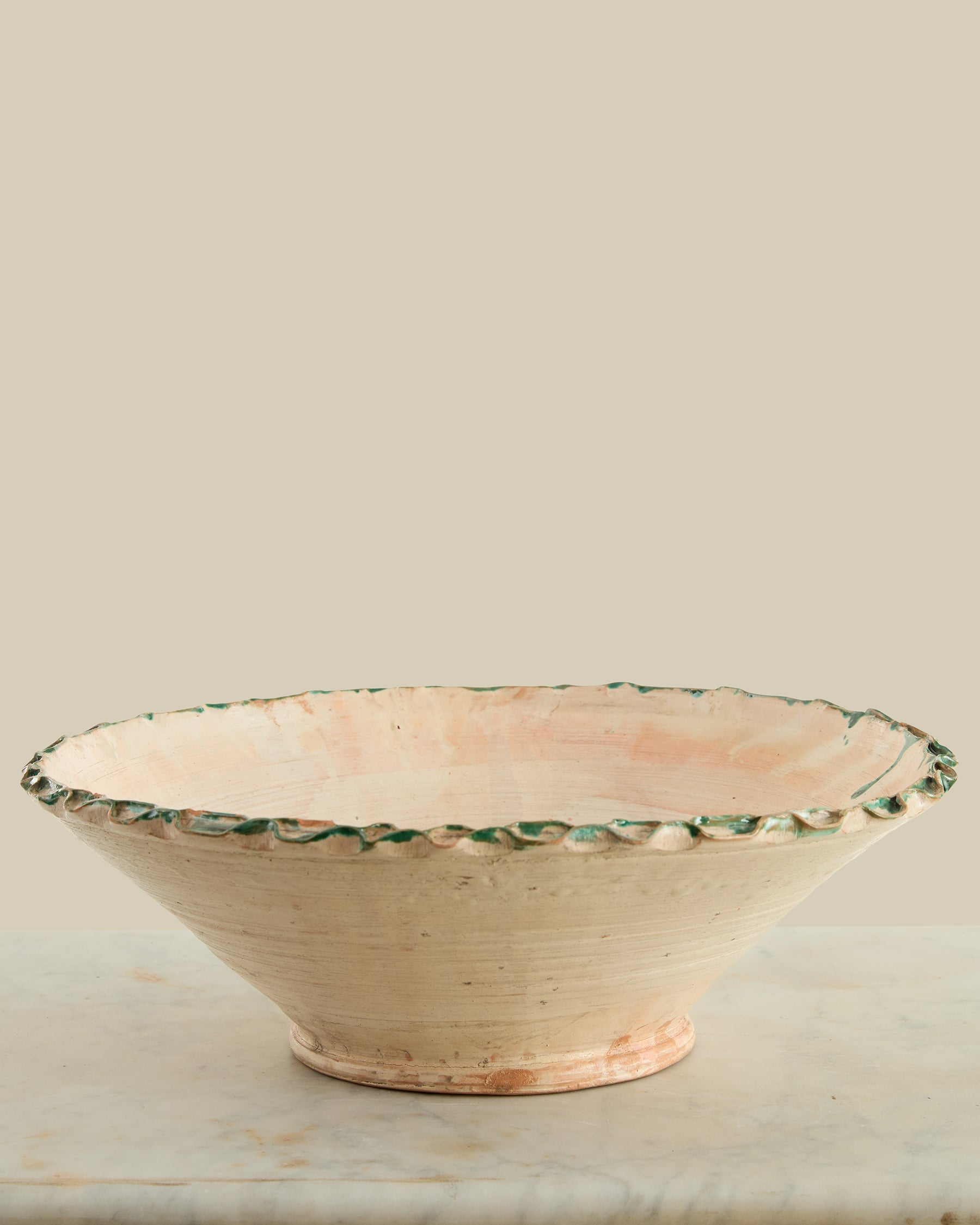This versatile serving bowl combines a soft milky glaze with a striking green dip, rooted in traditional pottery. Originally designed for kneading dough and serving food, it remains equally functional today—whether you're mixing, presenting, or simply displaying its charming handcrafted appeal. The dual-tone finish and practical shape make it a timeless addition to any kitchen or table.