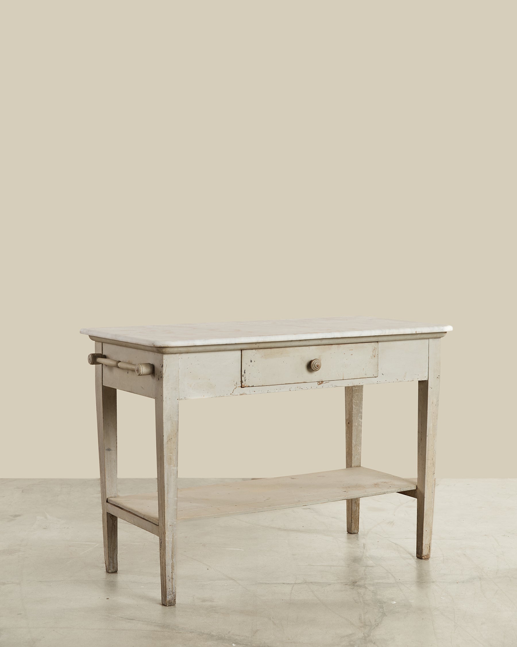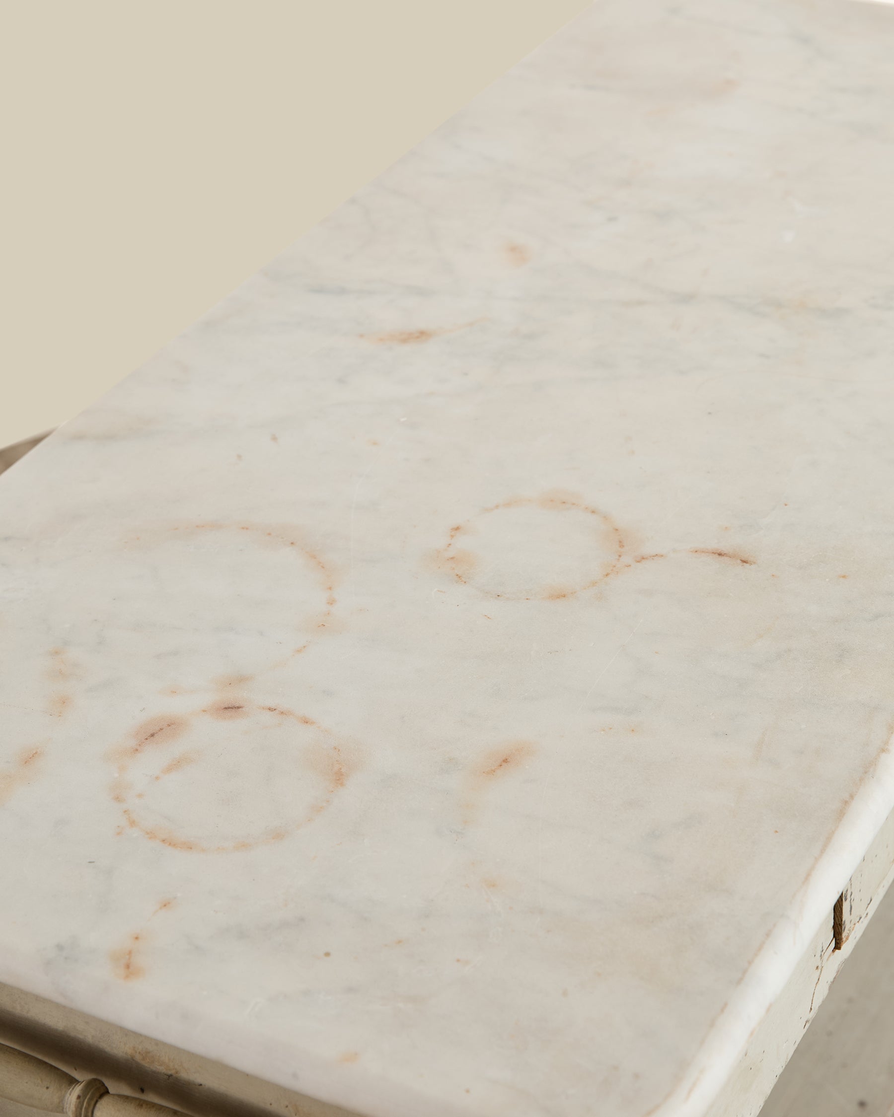 This marble top table combines natural beauty with vintage charm. The weathered blue paint finish gives it an authentic, aged appearance that works with any décor style. Topped with cool marble, it's both durable and elegant.