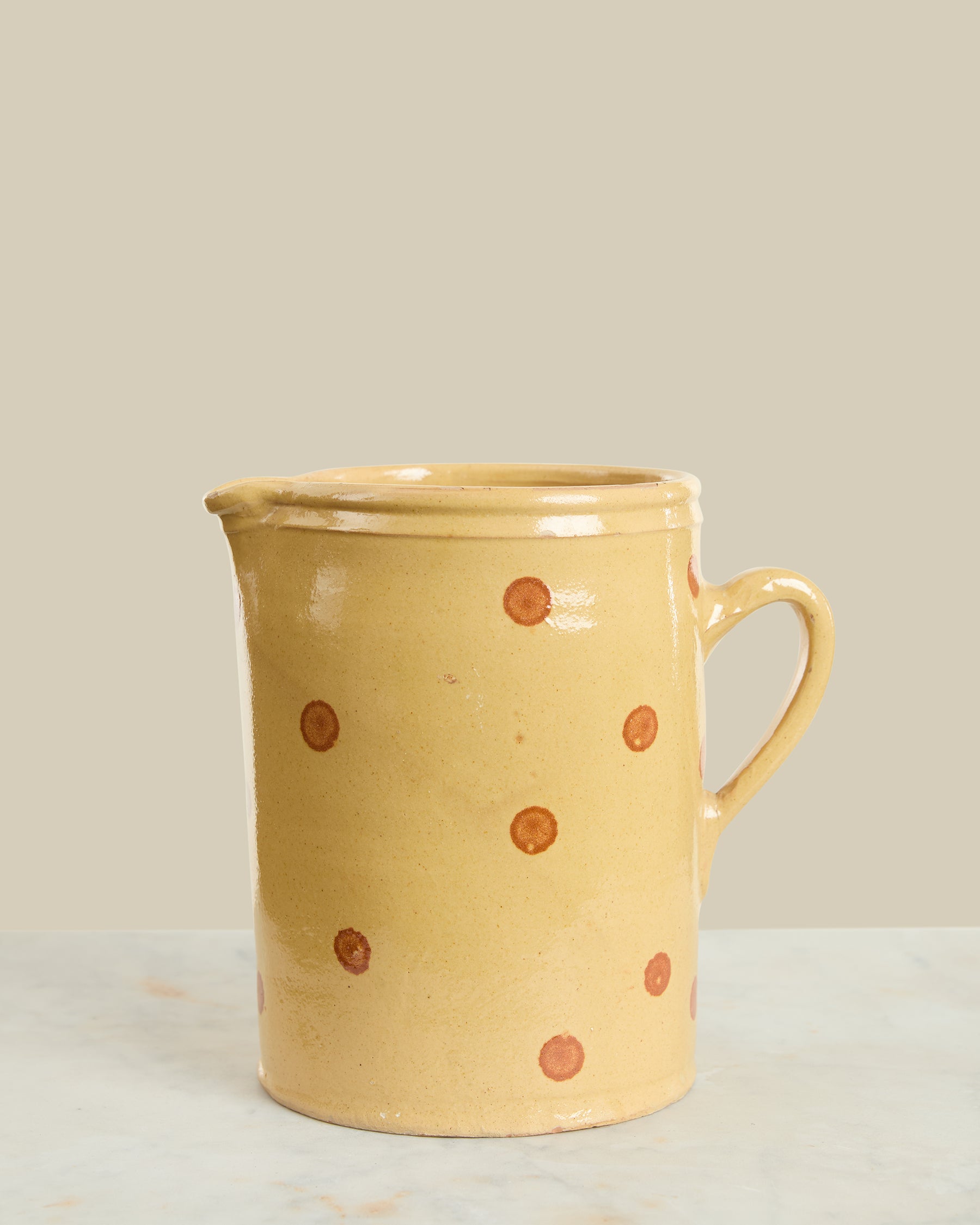 This substantial 19th-century French earthenware pitcher combines rustic charm with timeless appeal. Its cheerful polka dot pattern adorns glazed stoneware crafted using traditional methods that have endured for generations. Spacious enough for everyday use or display, it works beautifully for serving beverages, arranging flowers, or as a standalone décor piece. A genuine antique that brings authentic French character and history into your home.