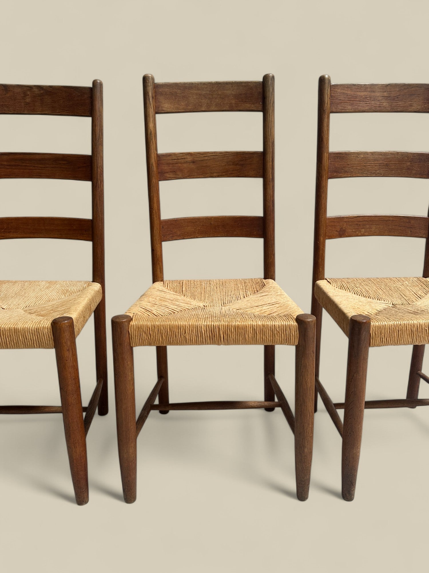 Classic set of 6 ladderback dining chairs featuring woven rush seats for natural comfort. The timeless design offers back support with horizontal slats, while the rush seating adds warmth and texture. Durable construction suitable for daily use in any dining space.