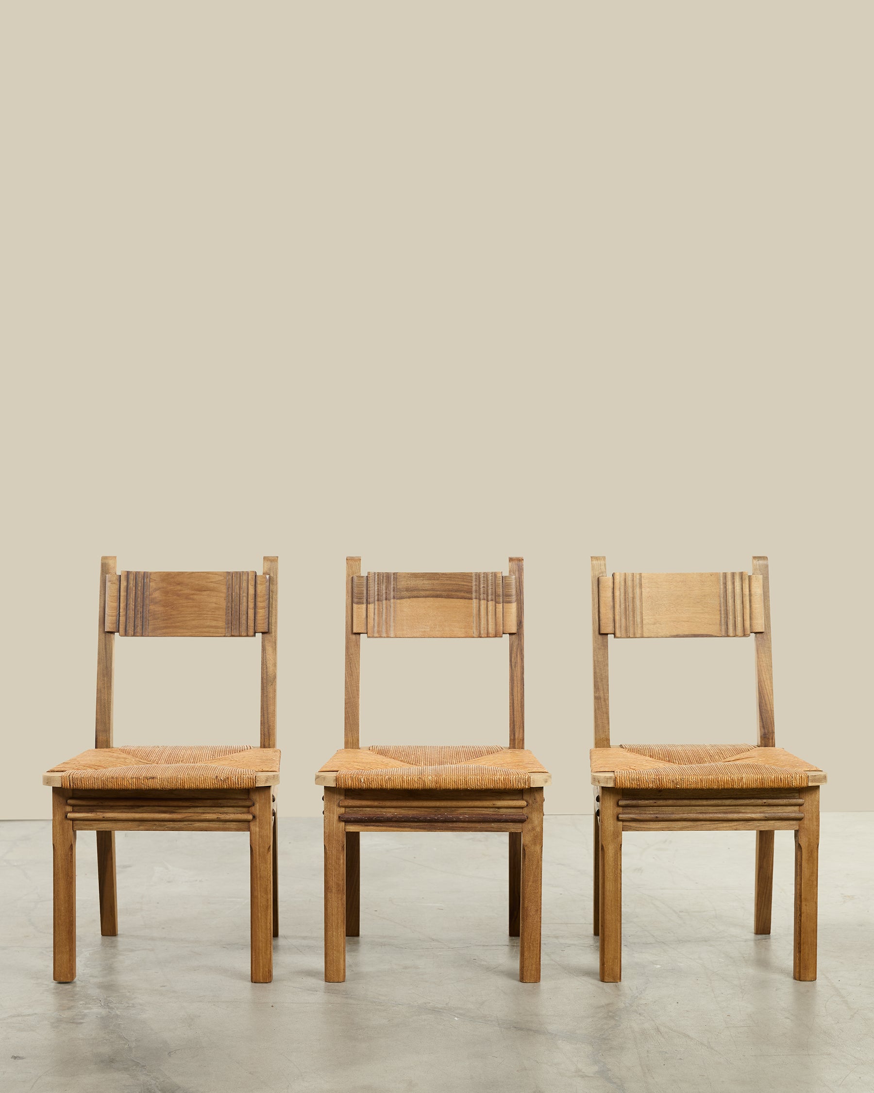 This complete set of eight 1950s walnut chairs brings authentic mid-century seating to your dining space. Each chair features beautiful wood grain detailing that showcases the natural character of walnut, paired with woven straw seats for comfort and texture. The streamlined wooden frames reflect the era's design sensibility while remaining versatile enough for modern interiors. Perfect for gatherings, these vintage pieces combine functionality with timeless appeal.