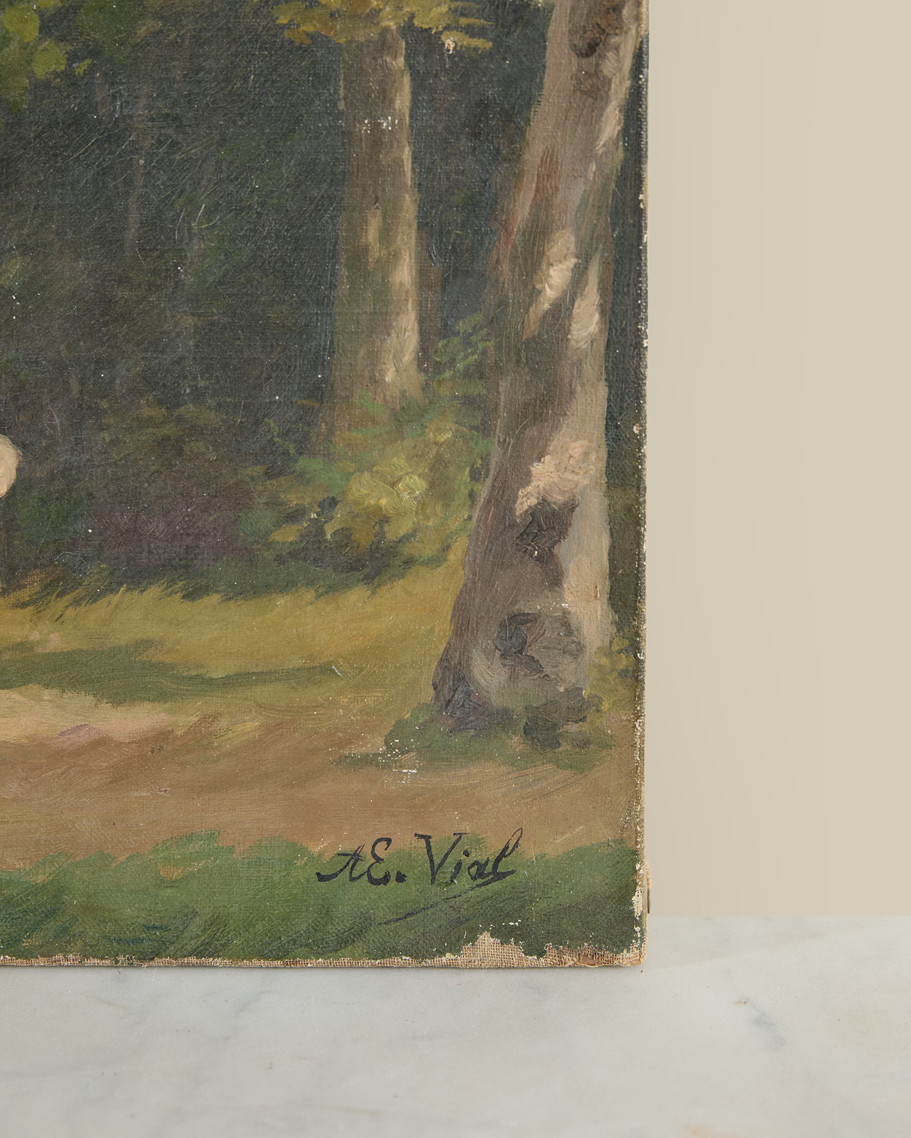 This signed oil painting on canvas depicts a serene forest well, a subject favored by 19th-century French artists. The work captures the quiet beauty of nature with authentic period technique and brushwork. A genuine historical artwork that brings European landscape tradition into any collection, this piece reflects the romantic sensibility of its era and stands as a testament to classical artistic craftsmanship.